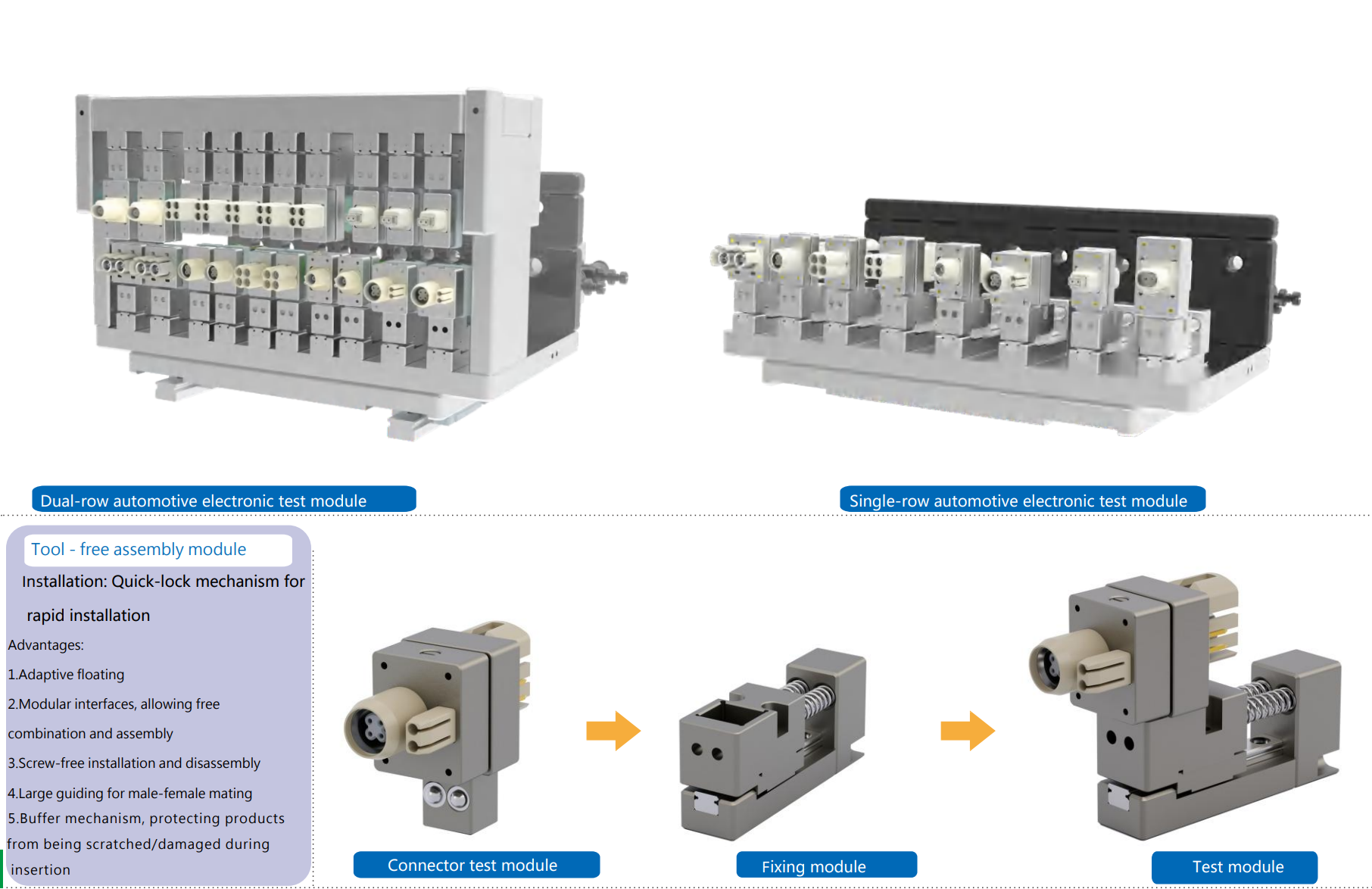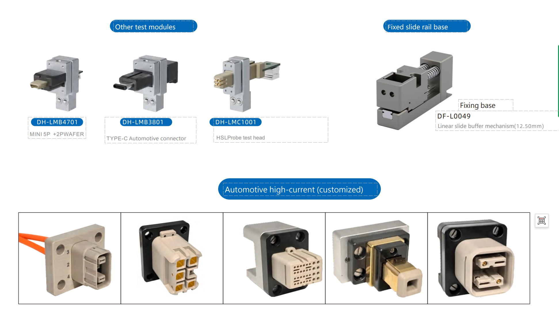 The Role of Automatic Plugging Modules in Automotive Component Interface Testing In automotive component interface testing, the automotive test connector serves as a core link, and the automatic plugging module maximizes the value of the automotive test connector throughout the process. First, the module precisely positions and connects the automotive test connector to the component interface, eliminating manual operation errors that often occur when inserting the automotive test connector manually. This ensures consistent contact between the automotive test connector and the tested part, laying a solid foundation for accurate test data. Second, during batch testing, the automatic plugging module enables rapid insertion and removal of the automotive test connector , significantly shortening the time each automotive test connector spends in the operation cycle. It also protects the automotive test connector from wear caused by frequent manual handling, extending the service life of each automotive test connector . Additionally, the module monitors the connection status of the automotive test connector in real time; if the automotive test connector has poor contact or misalignment, it immediately alerts and adjusts, ensuring the automotive test connector always maintains a stable working state, thus guaranteeing the reliability and efficiency of automotive component interface testing.